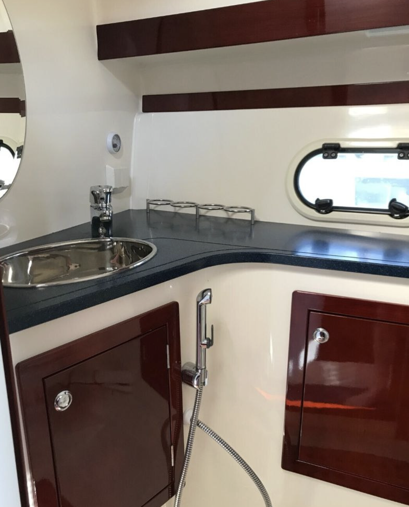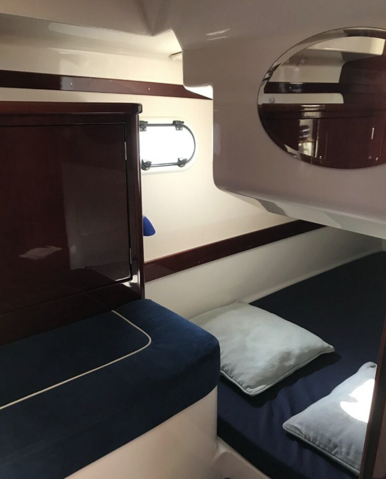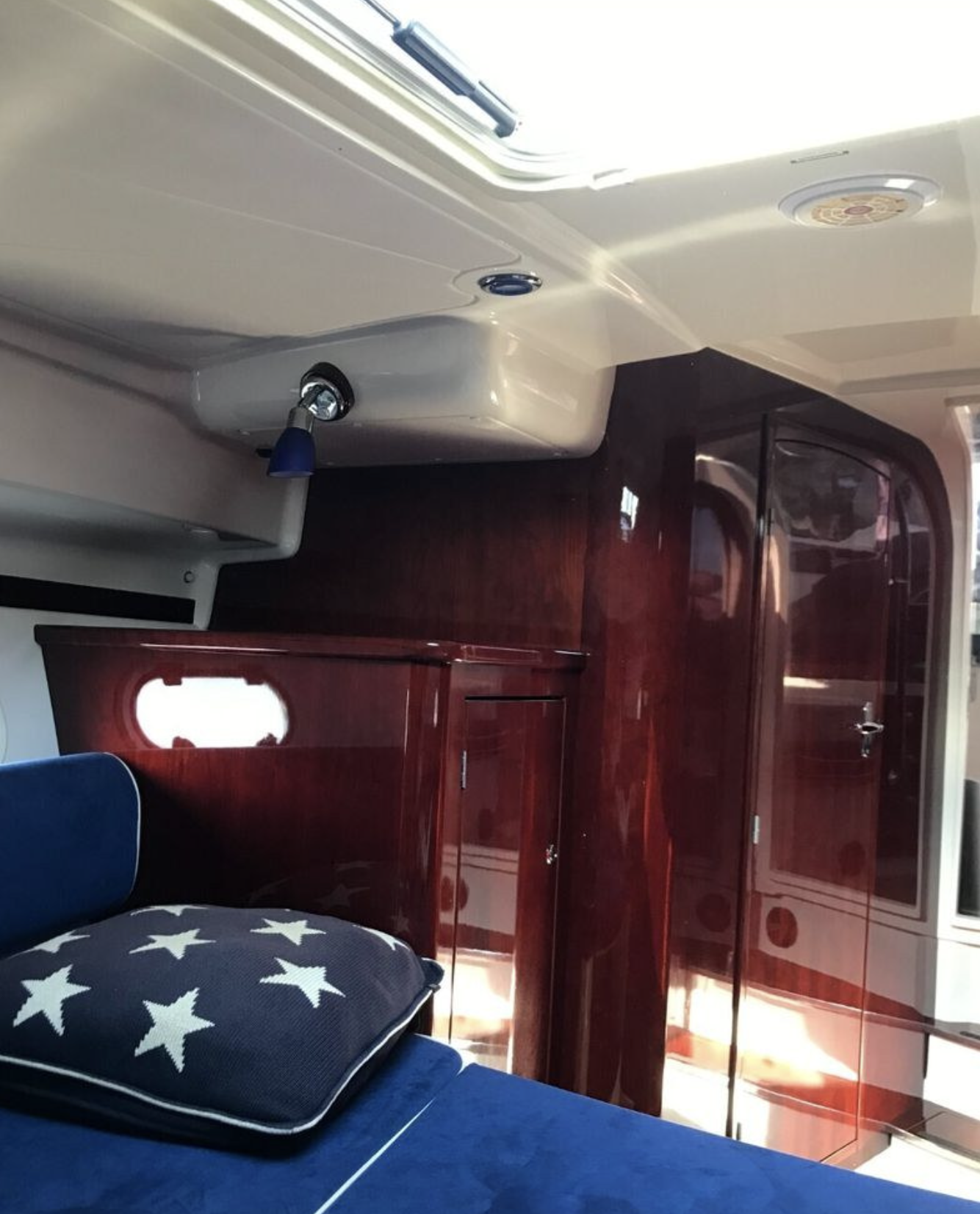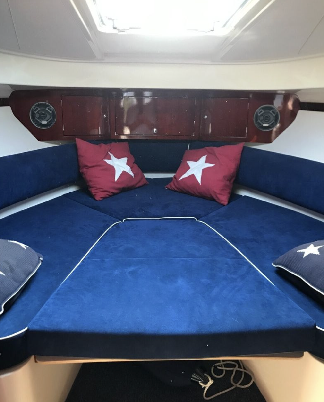 Båten är mycket välutrustad och erbjuder generösa utrymmen både i sittbrunn och ruff. Ombord finns en bekväm sovkabin samt en stickkoj, båda med måttanpassade latexmadrasser. I aktern finns en rymlig U-soffa med bord som kan omvandlas till solbädd eller extra bädd. Det praktiska pentryt är utrustat med keramisk spishäll, stor kyl och diskho, och toaletten är placerad i ett separat utrymme. Förvaringsmöjligheterna är goda, och med Wallas dieselvärmare är båten anpassad för bruk under större delen av året.