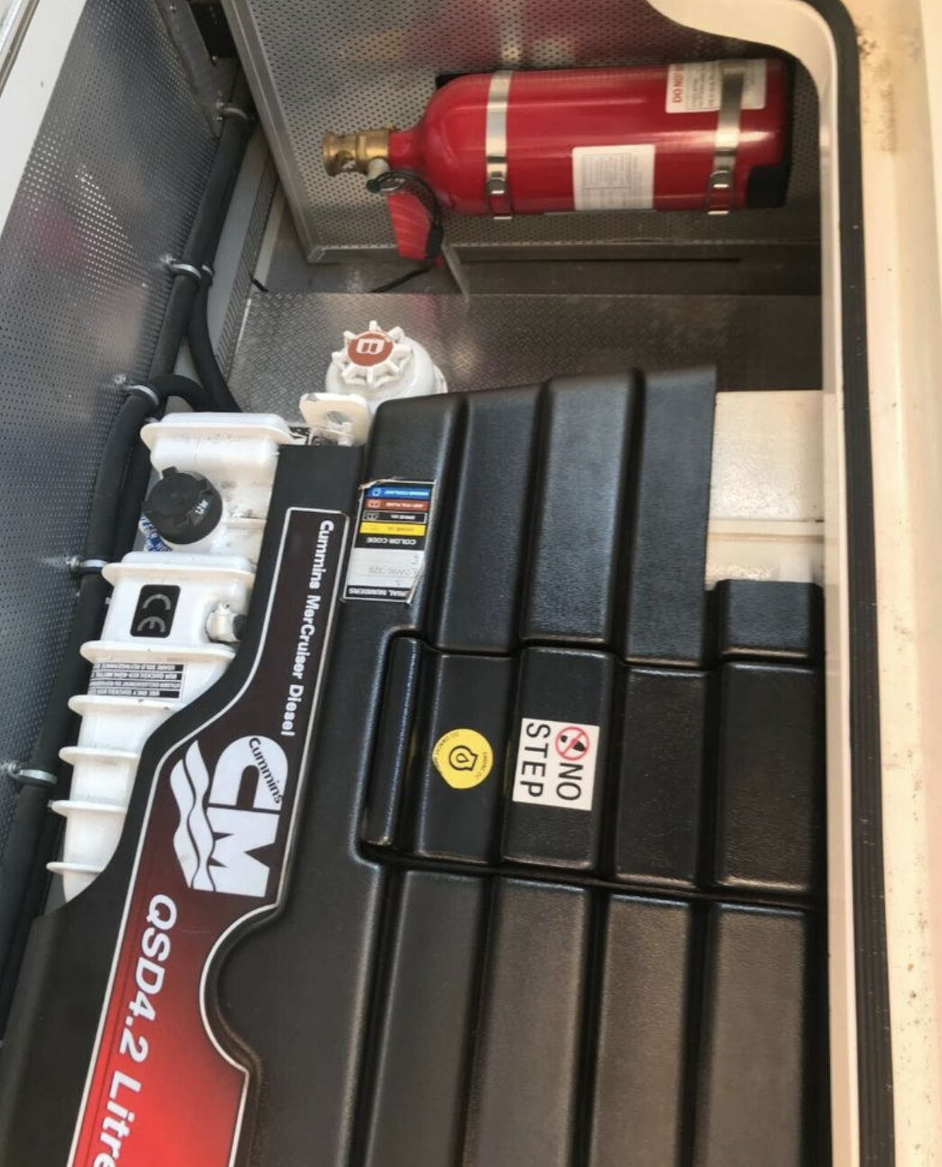 Samma professionella varv har sedan ny skött upptagning, vinterförvaring i uppvärmd hall samt årliga servicearbeten av motor, drev och övriga system med auktoriserad expertis. Båten är utrustad med en MerCruiser dieselmotor på 350 hk som har gått 739 timmar. Motorn har servats regelbundet och är i gott skick. Drevet byttes ut 2019 på garanti, och i samband med detta byttes även bälgar och växelvajer.