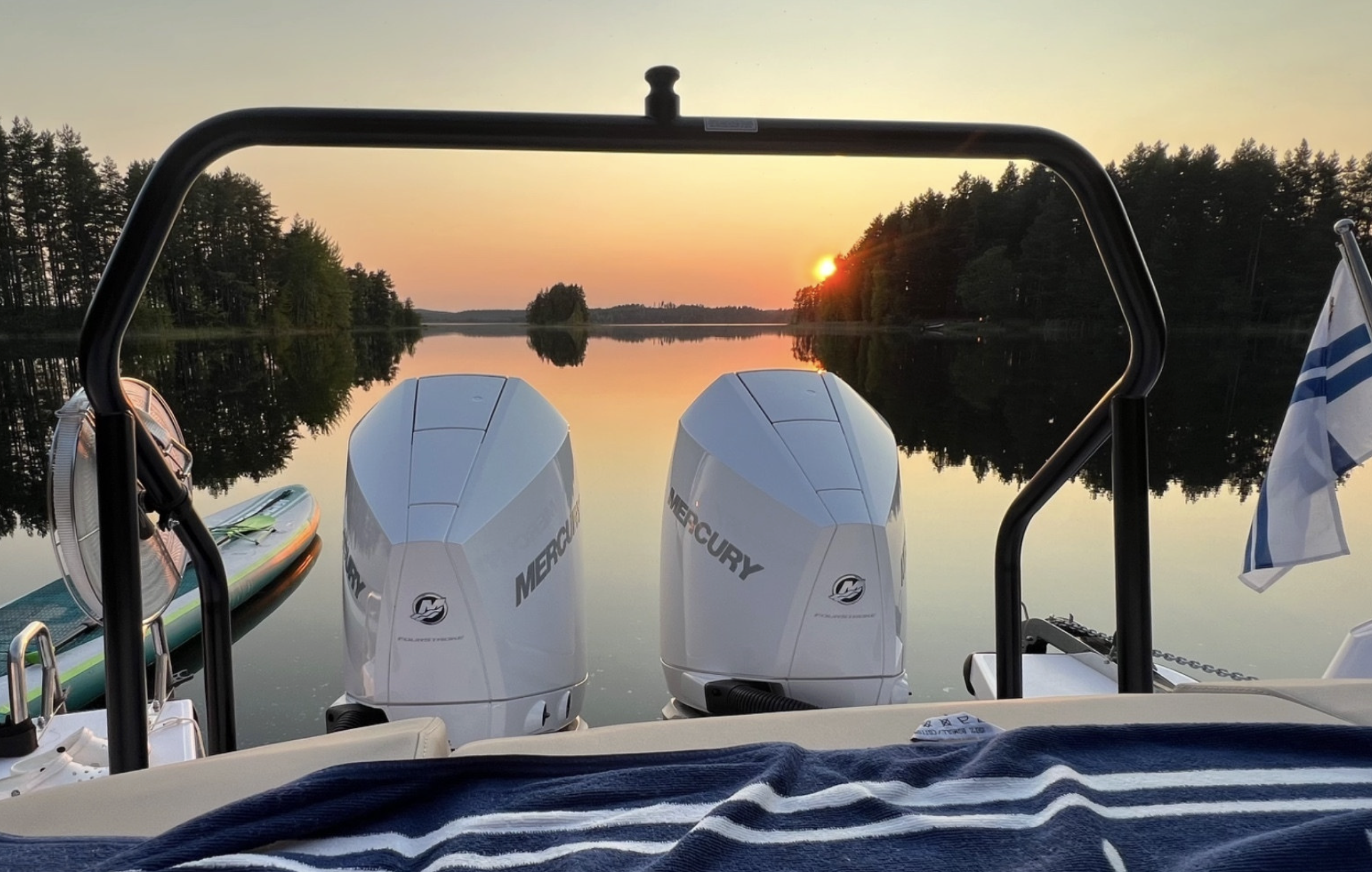 Denna båt är utrustad med två Mercury Verado V8 300 hk utombordare som har gått 220 timmar. Motorerna har servats regelbundet och har full servicehistorik. Båten har alltod vinterförvarats inomhus.